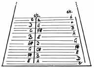 A third problem is that, assuming the central line to represent a bridge, each string is divided into two portions, giving only two series of notes, not three. We should presumably take the diagram to be a simplification of the most common system, of strings alternately divided and undivided, only half the total number of courses having been shown; and presumably the first series is that which is usually played immediately to the left of the bridge, not at the far left as shown. There could be other interpretations, of course, but since an interpretation following common practice produces a feasible result there seems little point in looking further at present: if this is a correct interpretation, the first series can be seen to be a fifth above the second series (or a fourth below it, of course): a few of the intervals are augmented or diminished, but the chessmen bridges normal on Italian salterii provide for such flexibility even though they are not shown. If we consider the second and third series to be provided by separate sets of strings, we find a fifth between adjacent courses, and the diagram may be represented thus: