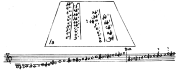 The note F♭ occurs twice, in each case in a position where there is already both an E♮ and an F♮ but no F# ; since the flat sign is otherwise not used in the diagram (D# and A# are used, for instance), it seems impossible that an F♭ tuned distinctly from E♮ can have been intended, nor does the normal usage, of F♭ = modern F♮ seem appropriate, since there are already Fs. Unlikely as it may seem, perhaps we must take them as meaning F#. The diagram itself does not show in which octave the various pitches lie, but these an be deduced; using the 'corrections' just discussed, the scheme has been reconstriced in Helmholtz' notation at fig. 81 and the overall range is also given in staff notation.